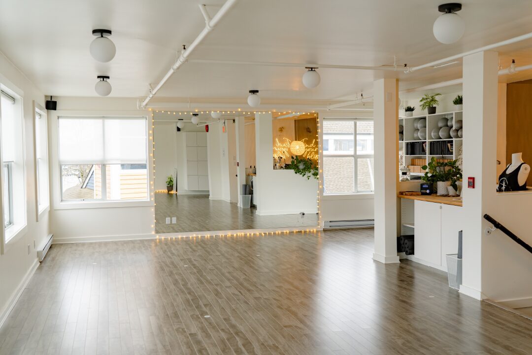Our bright and welcoming studio spans 800 square feet, making it the perfect venue for workshops, yoga, meditation, and dance classes. The serene neutral white palette creates an atmosphere of well-being, complemented by six windows that flood the space with natural light and offer stunning mountain and water views. Additionally, a floor-to-ceiling mirror adorns one wall, inspiring movement and correct alignment.